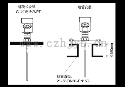 導波雷達物位計可采用螺紋連接,螺紋的長度不要超過15mm,還可以采用在短管上安裝。安裝短管直徑在2″至6″則安裝短管高度應≤100mm(螺紋及短管的長度越短,測量越穩定),若安裝短管較長,理想狀態應將短管割短,或底部固定纜式探頭及選用絕緣對中支架以避免纜式探頭與短管末端接觸。